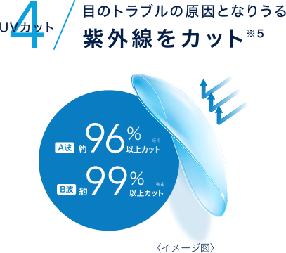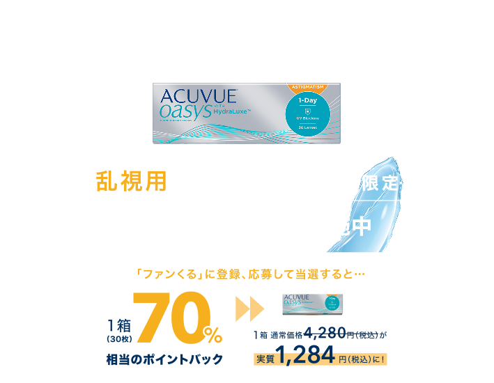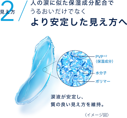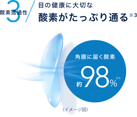 ※装用感、見え方には個人差があります。 ※1 1,624件の眼鏡処方箋のデータベースより、片眼に0.75D以上の乱視を有する患者は47.4%と報告されています。コンタクトレンズ装用者の約1/3は乱視矯正の必要があると推計されています。参考文献: Young, G., et al. Prevalence of astigmatism in relation to soft contact lens fitting. Eye Contact Lens. 2011 Jan;37(1):20-25. ※2 PVP:ポリビニルピロリドン ※3 酸素流量率が裸眼時の約98%。酸素流量率=コンタクトレンズ装用時に角膜に届く酸素の量/裸眼時に角膜に届く酸素の量。A Model of Oxygen Flux:Brennan 2001(開瞼時)に基づく/レンズ中心部における測定。 ※4 オアシスシリーズの場合 ※5 Johnson & Johnson VISION CARE, INC. データより。UV吸収剤を配合したコンタクトレンズは、UV吸収サングラスなどの代わりにはなりません。本製品の使用と、紫外線に起因する眼障害リスク低減の関係については、臨床試験において確認されておりません。 ※6 涙を保持する働きを持つ。 ※7 ×10-9(cm・mLO₂ /sec・mL・mmHg) 測定条件35℃(-3.00Dの場合)Polarographic method, boundary and edge corrected. ※8 ×10-9(cm・mLO₂ /sec・mL・mmHg) 測定条件35℃(-3.00Dの場合)